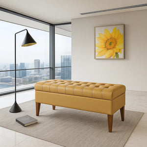 This leather-upholstered bench features two removable top covers which is reversible to be used as a padded cushion seat or a tray. The bench also features large storage compartment areas within.