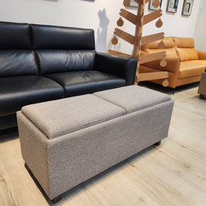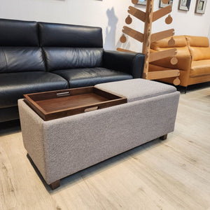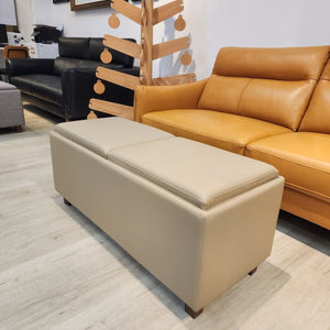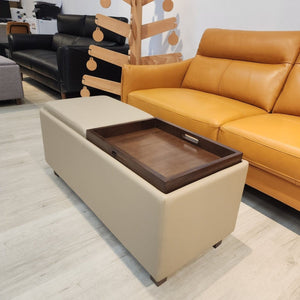 This leather-upholstered bench features two removable top covers which is reversible to be used as a padded cushion seat or a tray. The bench also features large storage compartment areas within.