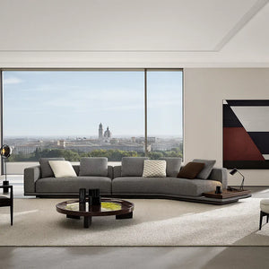 Cavora’s language is one of continuity and flow. Straight modules converse with angled and sloping elements, while integrated coffee tables emerge seamlessly, as though part of the original sketch. Sometimes the base extends beyond the cushions, carrying a shelf—like a quiet punctuation mark—crafted from Canaletto walnut, Liquorice ash, or fine marble and granite. Each surface becomes part of the narrative, a place to rest a glass, a book, or a moment.