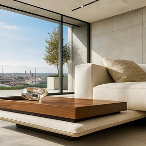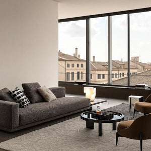The collection extends beyond seating. Coffee tables and side tables, echoing the sofa’s geometry and base details, layer the space with variation in height and proportion. Bronze-finished metal frames ground rich wooden tops, their horizontal grooves repeating the quiet rhythm of the sofa’s design.
