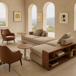 This is a sofa attuned to the rhythms of contemporary life, where the living room is not only a place to gather, but a place to linger, to work, to read, to dine, to dream. Its modularity adapts, its personality evolves — and at its heart lies an innovation in function: an armrest reconceived. Whether wrapped in sumptuous upholstery or crafted as a cowhide-clad metal console, it becomes more than a boundary — it’s a surface for books and glasses, a shelf for treasured objects, a quiet partner in the rituals of your day.