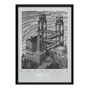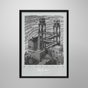 This licensed art print features “Waterfall” (1961) by M.C. Escher, one of his most recognised works exploring visual paradoxes and architectural impossibility. The artwork depicts a perpetual-motion water system that defies logic and physics, rendered with extraordinary precision. A powerful conversation piece, it brings a sense of intrigue, structural brilliance and surreal depth to modern and intellectually driven interior spaces.
