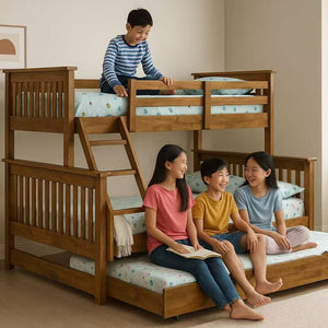 ASolid Wood Bunk Bed must be exceptionally strong, especially for super single-sized models. The increased width and mattress size demand a sturdy frame to withstand greater forces. Solid wood is naturally resilient, absorbing stress without warping or bending. This makes our Americana Solid Wood Bunk Bed the ideal choice for ensuring both safety and longevity while maintaining a stylish look.