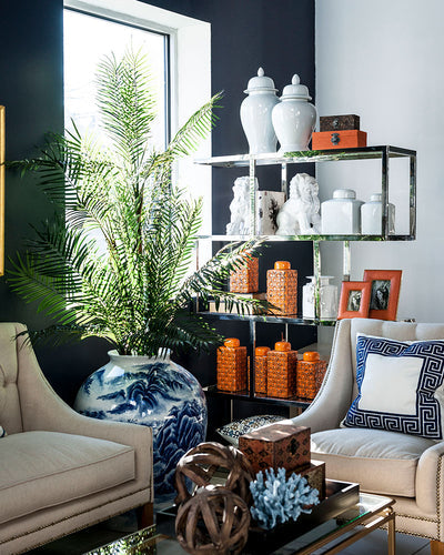 Decorative wall shelving and standing shelving add storage and ambiance. Decorative screens both separate spaces and add visual interest. Small pieces like stools, side tables and end tables can hold remotes, drinks, or be brought out for extra guests.