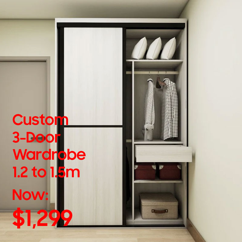 Our new and improved custom-built 3-door wardrobe featuring an E0 super-engineered board available in more than 40+ colors to choose from!