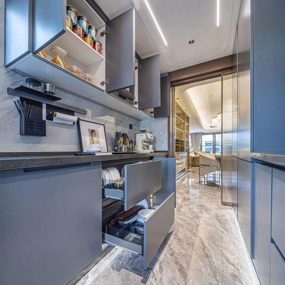 We use premium European hardware, including soft-close hinges, heavy-duty drawers, and smooth hydraulic systems engineered for durability, quiet operation, and everyday comfort.