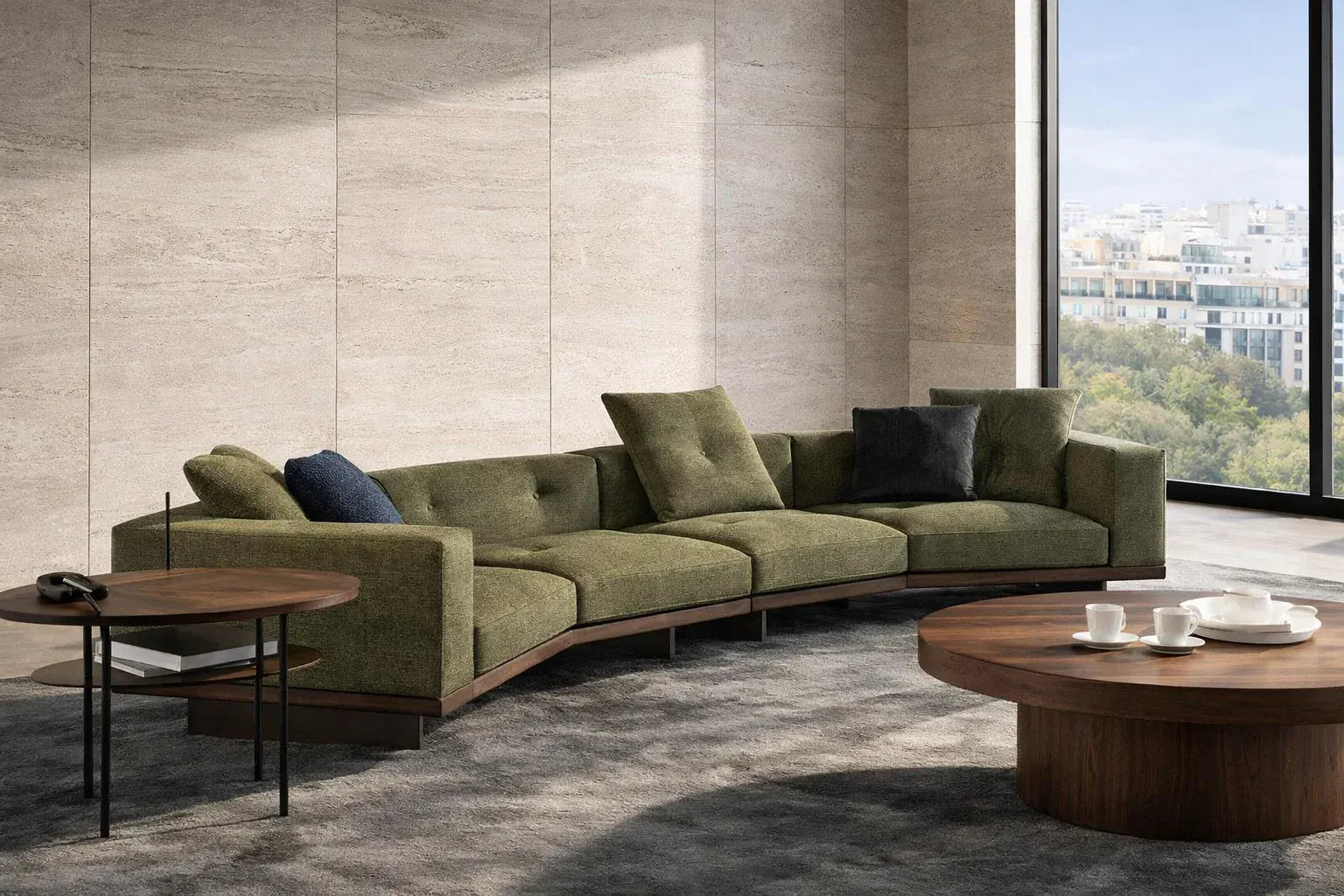 Sculptural curved-back modular sofa with deep lounge comfort—built to stand alone or expand into statement layouts.