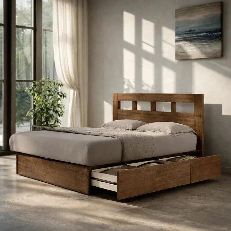 Selected solid wood bed designs feature integrated storage solutions. Availability and configuration vary by model.