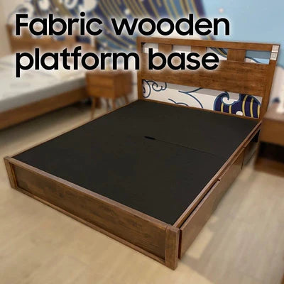 - Fabric upholstered wooden plank bed base with supporting bed slats